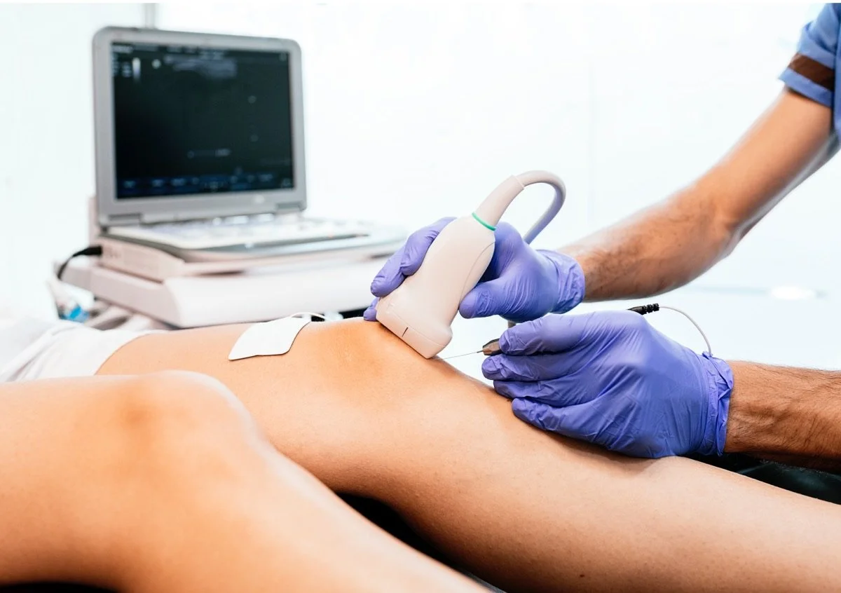 The physician uses real-time ultrasound guidance to precisely deliver the injection to the target area.